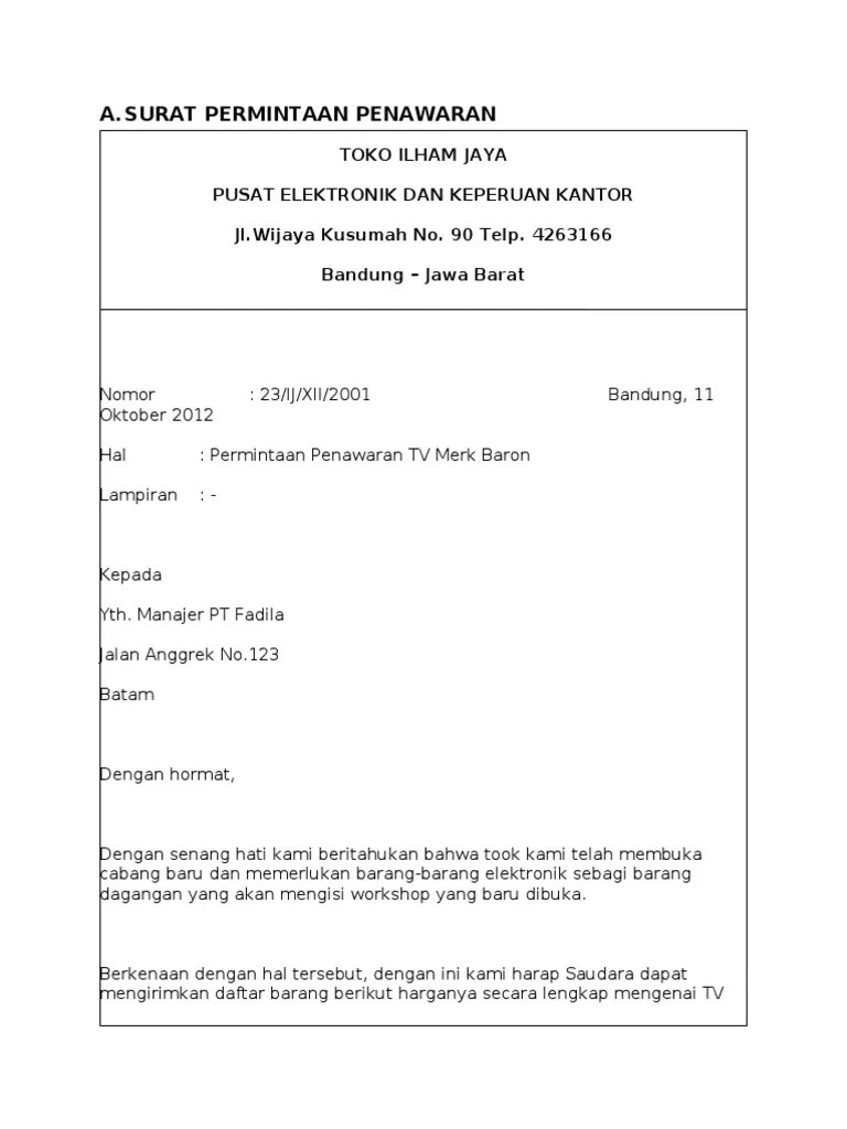 8 contoh surat niaga penawaran permintaan jasa barang kerjasama pengertian surat niaga syarat jenis macam fungsi contoh 8 contoh surat niaga . Baik untuk kegiatan penawaran, permintaan, ataupun sebagai . Surat penawaran menjadi alat pemasaran dari sebuah produk atau jasa secara awal. Contoh surat niaga penawaran : Ini merupakan salah satu contoh surat niaga (surat penawaran) semoga bermanfaat untuk pembelajaran! Yang kedua menyebutkan jenis dan . Yang pertama, menyebutkan surat pemesanan berdasarkan dari surat penawaran ataupun iklan dan lain sebagainya. Nah, surat penawaran yang merupakan bagian dari surat niaga ini, umumnya digunakan untuk membangun hubungan dengan relasi bisnis dalam rangka menjelaskan produk . Berikut ini merupakan informasi lengkap beserta contoh surat niaga yang biasa dibuat untuk keperluan jual beli. Mtg_ok@plasa.com saya akan abntu sebisa mungkin!. Itulah mengenai contoh surat niaga dalam berbagai hal. Contoh surat niaga tentang penawaran barang : Kalau mencari sesuatu, belum bisa enemukannya.